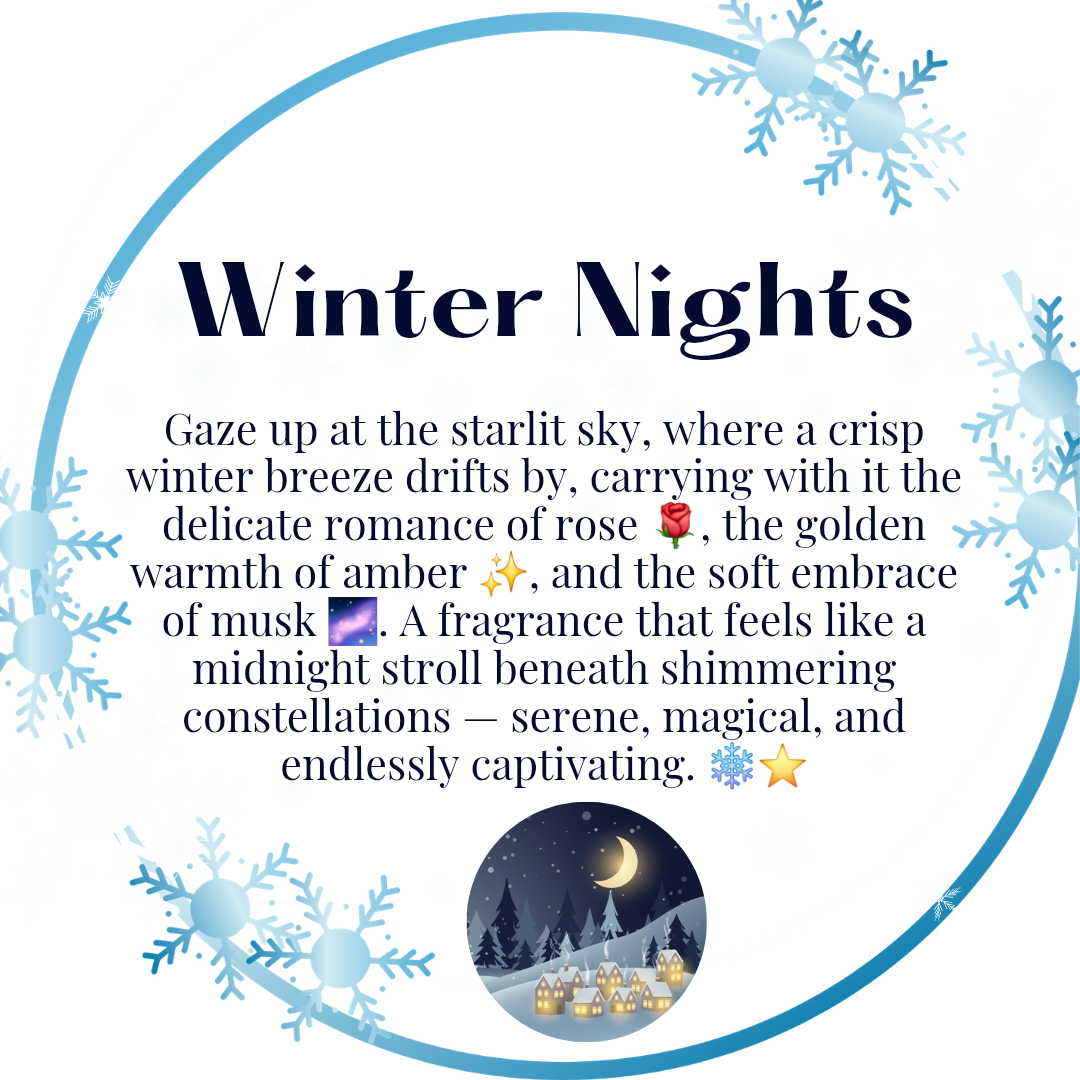 Gaze up at the starlit sky, where a crisp winter breeze drifts by, carrying with it the delicate romance of rose 🌹, the golden warmth of amber ✨, and the soft embrace of musk 🌌. A fragrance that feels like a midnight stroll beneath shimmering constellations — serene, magical, and endlessly captivating. ❄️⭐